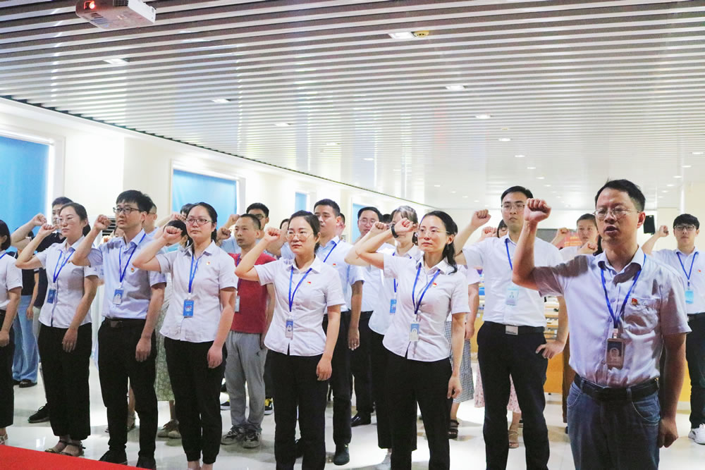 中共華益藥業(yè)科技(安徽)有限公司支部委員會全體黨員佩戴黨徽,宣讀入黨誓詞: